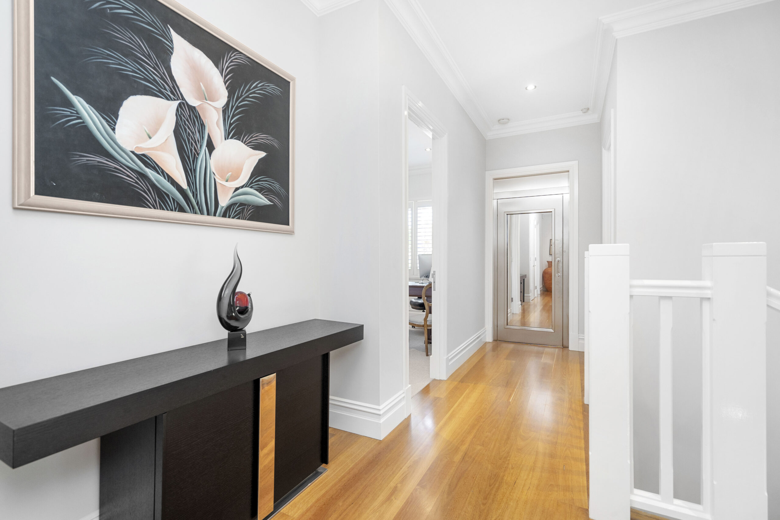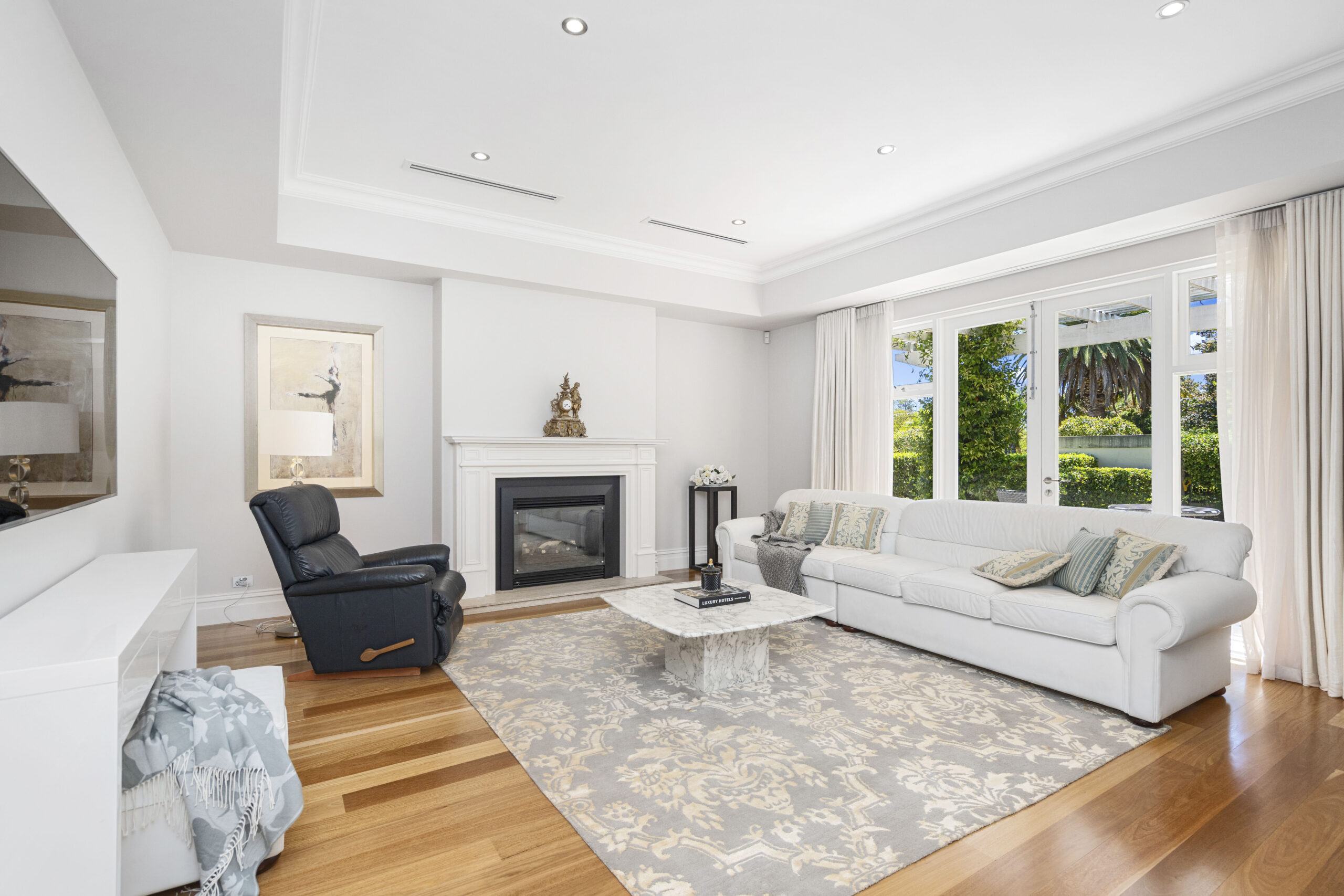 The ground floor is devoted to living and entertaining. Beautiful solid wooden flooring flows throughout the internal zones on this level, with two interior living areas, including the expansive family zone and the separate, light-filled formal lounge with a feature gas fireplace. Here, you’ll enjoy a picturesque view of the beautifully manicured gardens or step out to the sunny terrace through French doors for fresh air.
