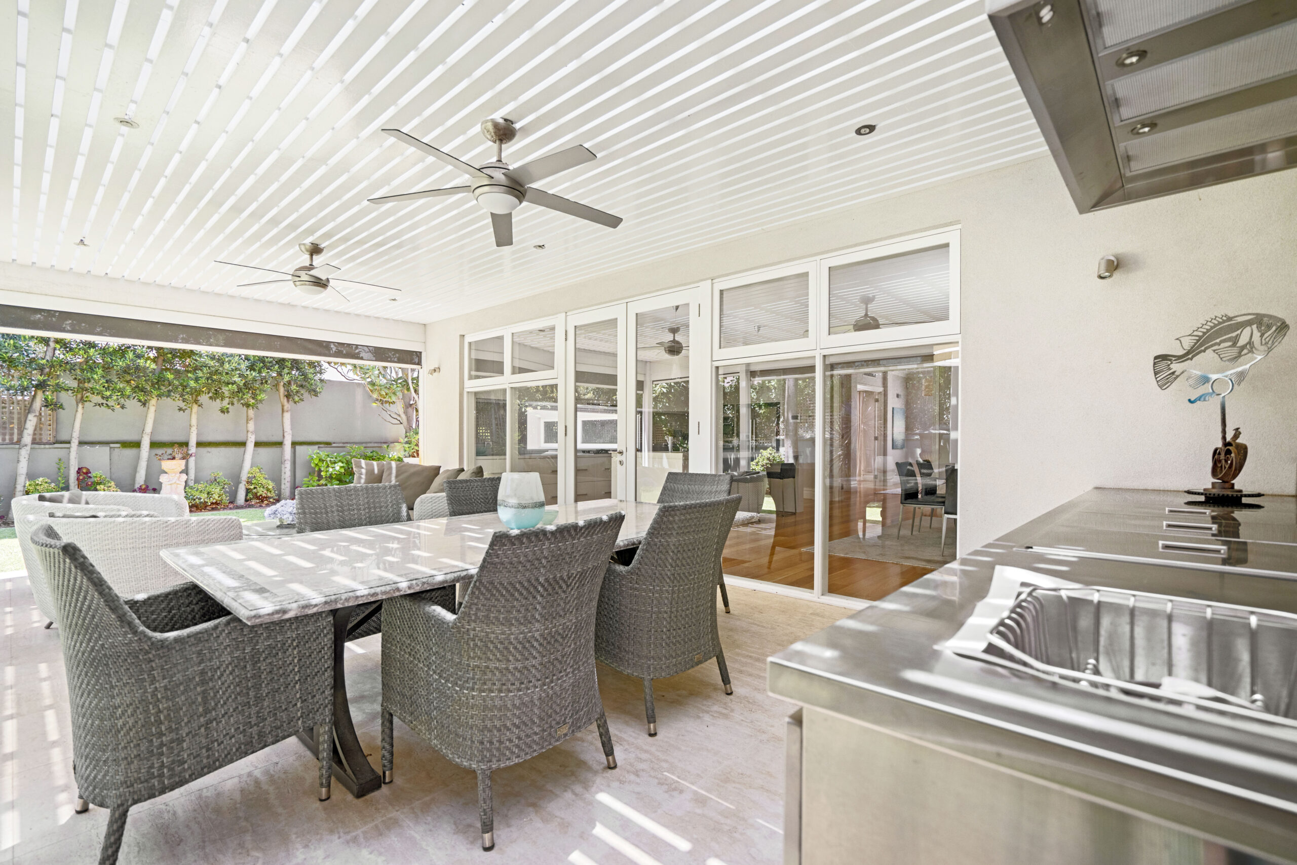 • Alfresco with travertine tiling, built-in BBQ/Teppanyaki grill and retractable shade blinds
