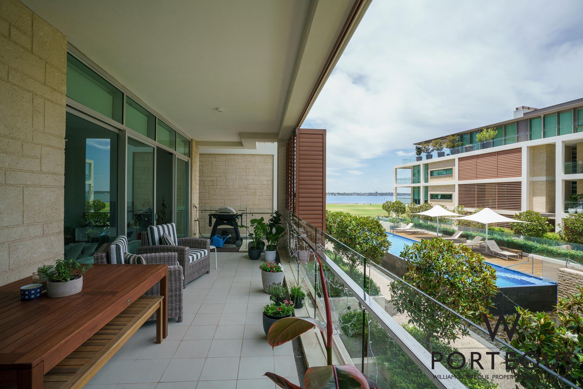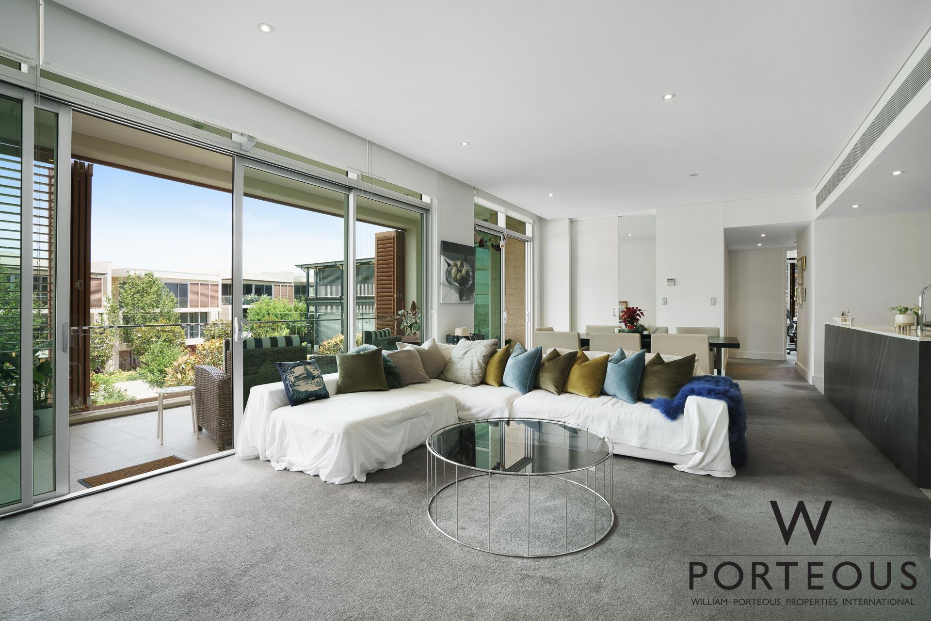 This remarkable 3 bedroom, 2 bathroom second floor apartment has a delightful feel from the moment you walk in the door. The open plan kitchen dining and lounge has its long axis fronting the central gardened courtyard, pool and a view through to the river and parkside playing fields. It is light, bright, welcoming and engaging.