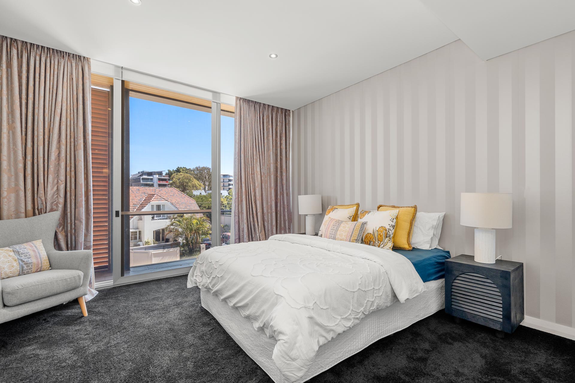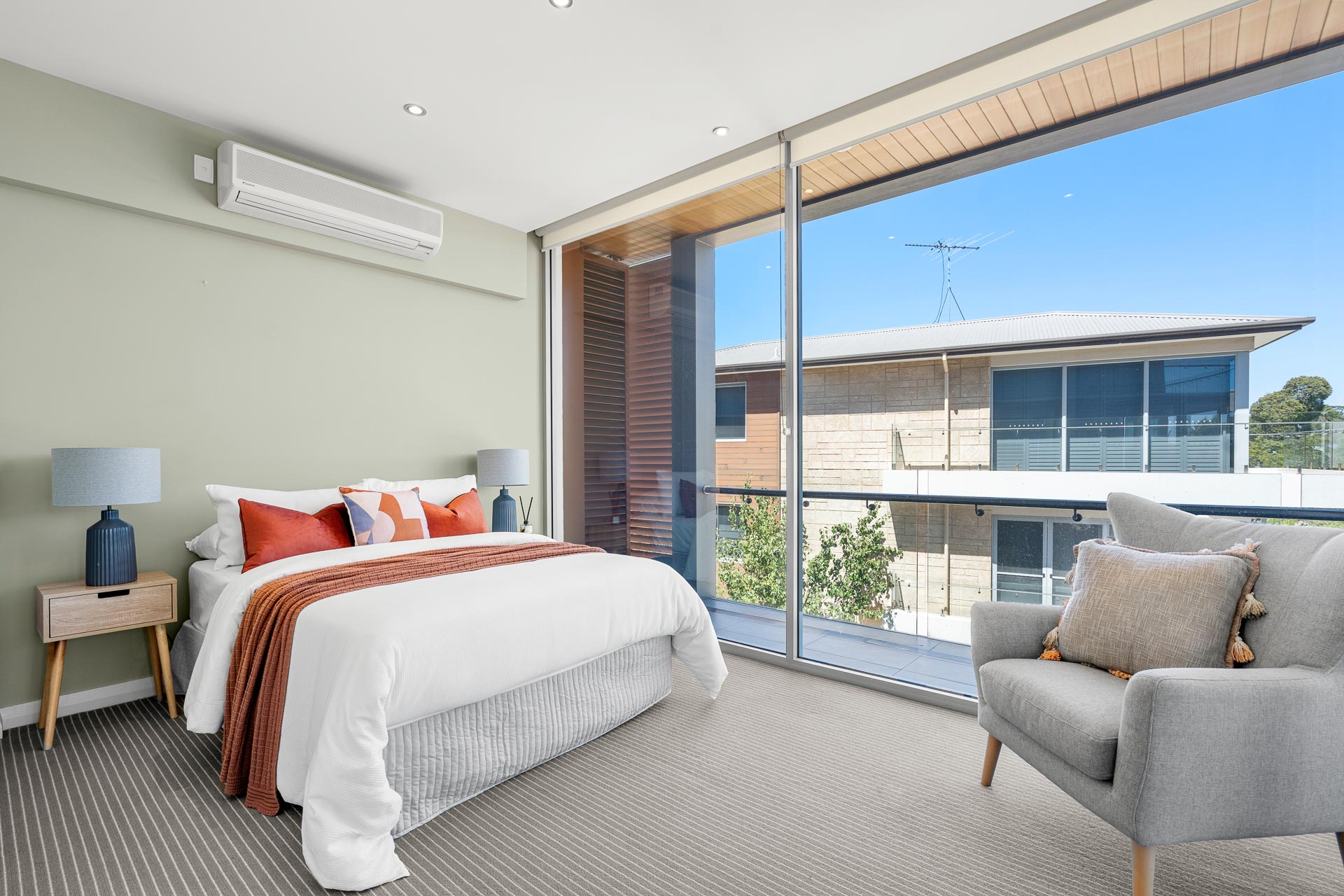 Occupying the west-facing corner of the home is bedroom 3. This is a highly versatile space and is designed with a sliding wall enabling you to run it as a private 3rd bedroom, or instead use it as a study, media room, or separate lounge space, which can be opened and connected to the main living space as and when you wish. This versatility is a brilliant idea and works very well in these three-bedroom formats. It has big floor-to-ceiling windows and a sliding glass door onto the main balcony. Window treatments let you control how much light you let in. It is a wonderful room year round.