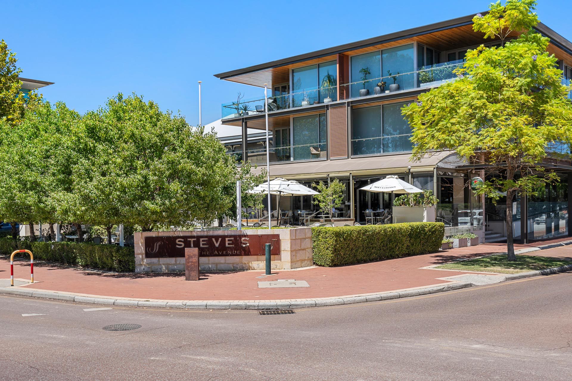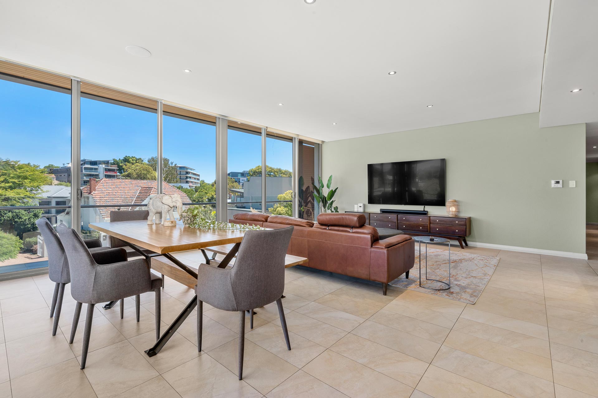 Located on level 1 in the iconic Steve’s building, enjoy a sleek and modern open-plan living, kitchen, and dining area with recessed ceilings and lighting, all overlooking a lengthy terrace facing the leafy enclave for which The Avenue is known, with a mix of full height sliding glass doors, windows, and bifold doors ensuring an abundance of natural northern light, year-round, and excellent connectivity and flow between in the indoor and outdoor areas. Electronic blinds on all the main living room windows add a touch of luxury and convenience.