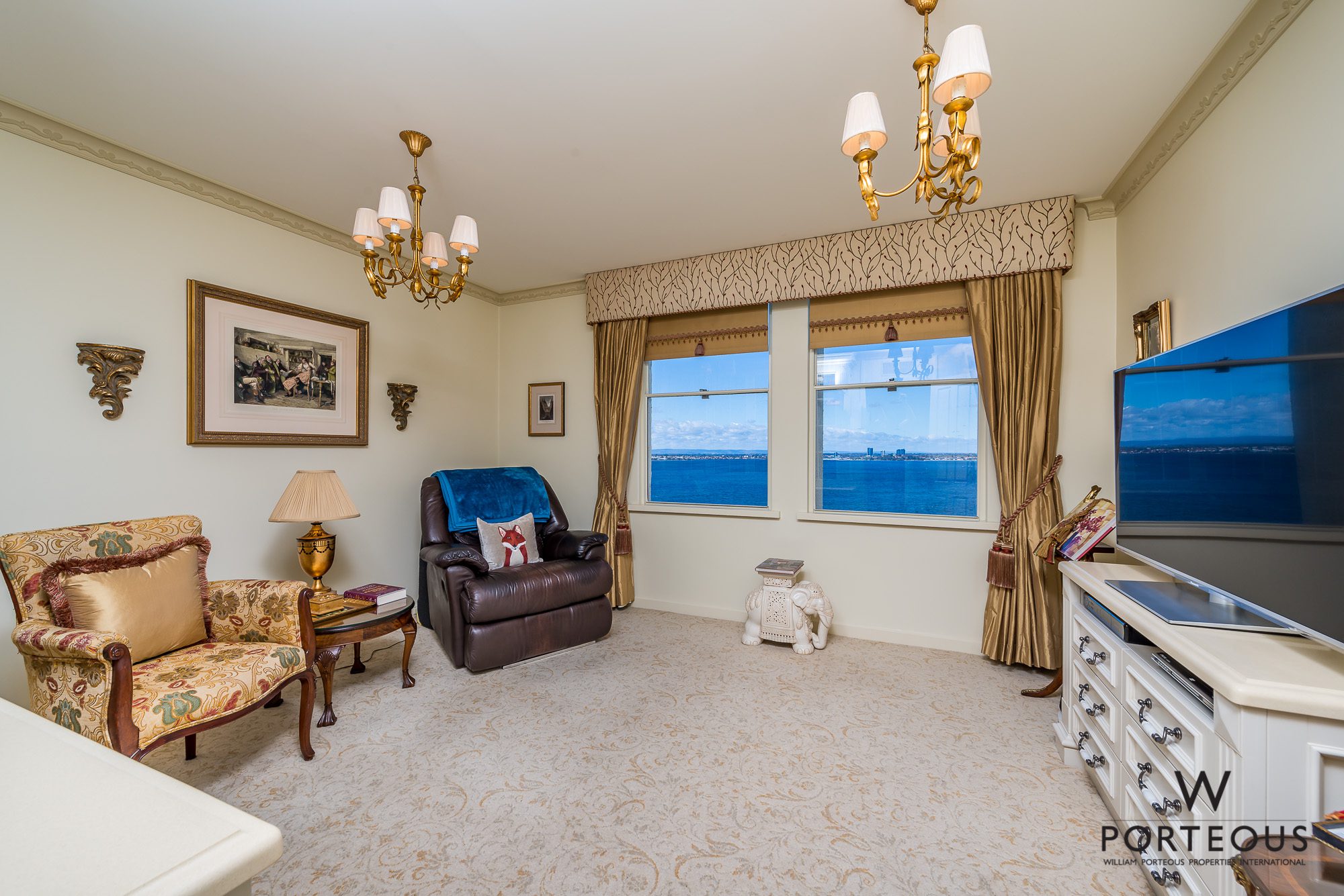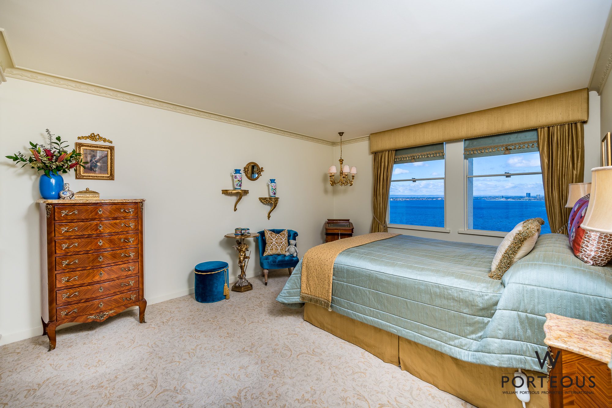 • Carpeted living spaces and bedrooms, inclusive of the master suite and a versatile 3rd bedroom/study with a bookcase and awe-inspiring panoramic river views