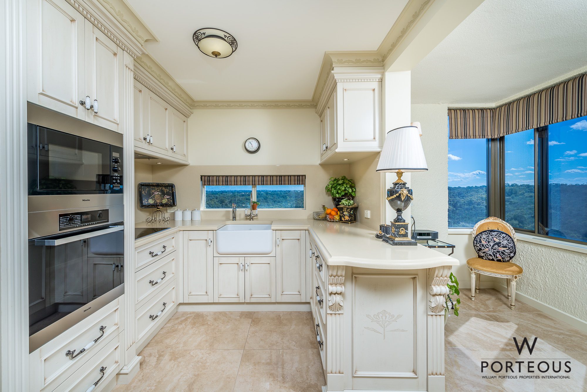 The kitchen features the treetop aspect, alongside ample storage options, a Shaws Classic sink, sublime built-in display cabinetry and sparkling Caesar Stone bench tops and splashbacks. A hot and cold-water “Zip” tap, integrated Miele microwave, oven, Induction-cooktop appliances, and an integrated fridge-freezer combination leaves you wanting for nothing.