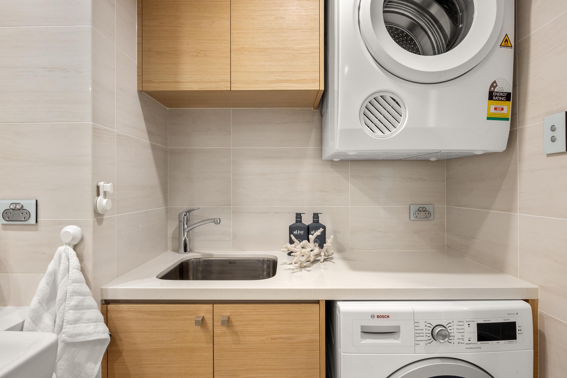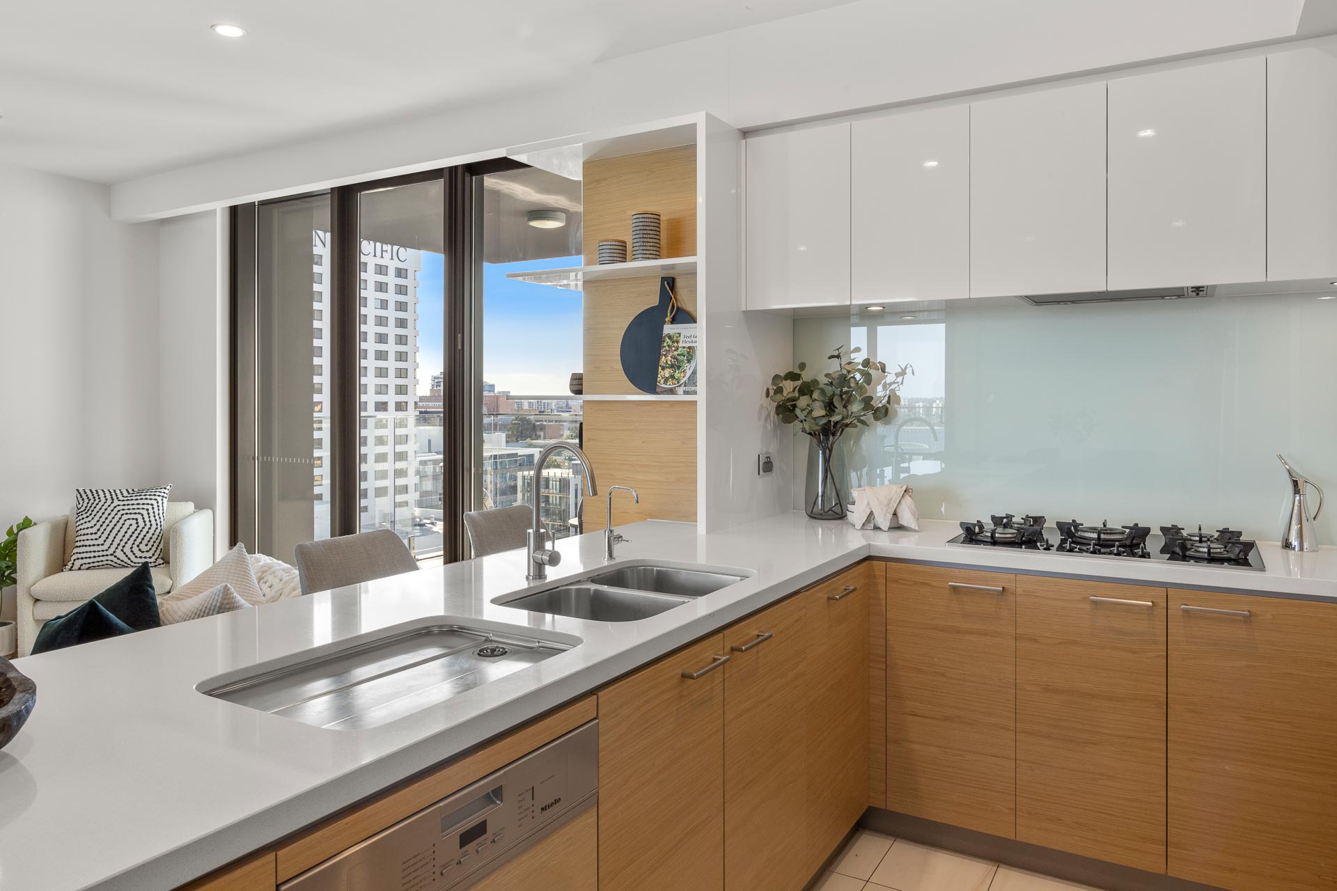 The kitchen is well conceived and executed with ample cabinet space, crisp white reconstituted stone benchtops, glass splashbacks and stainless steel features with a Miele oven, five burner cooktop and microwave.