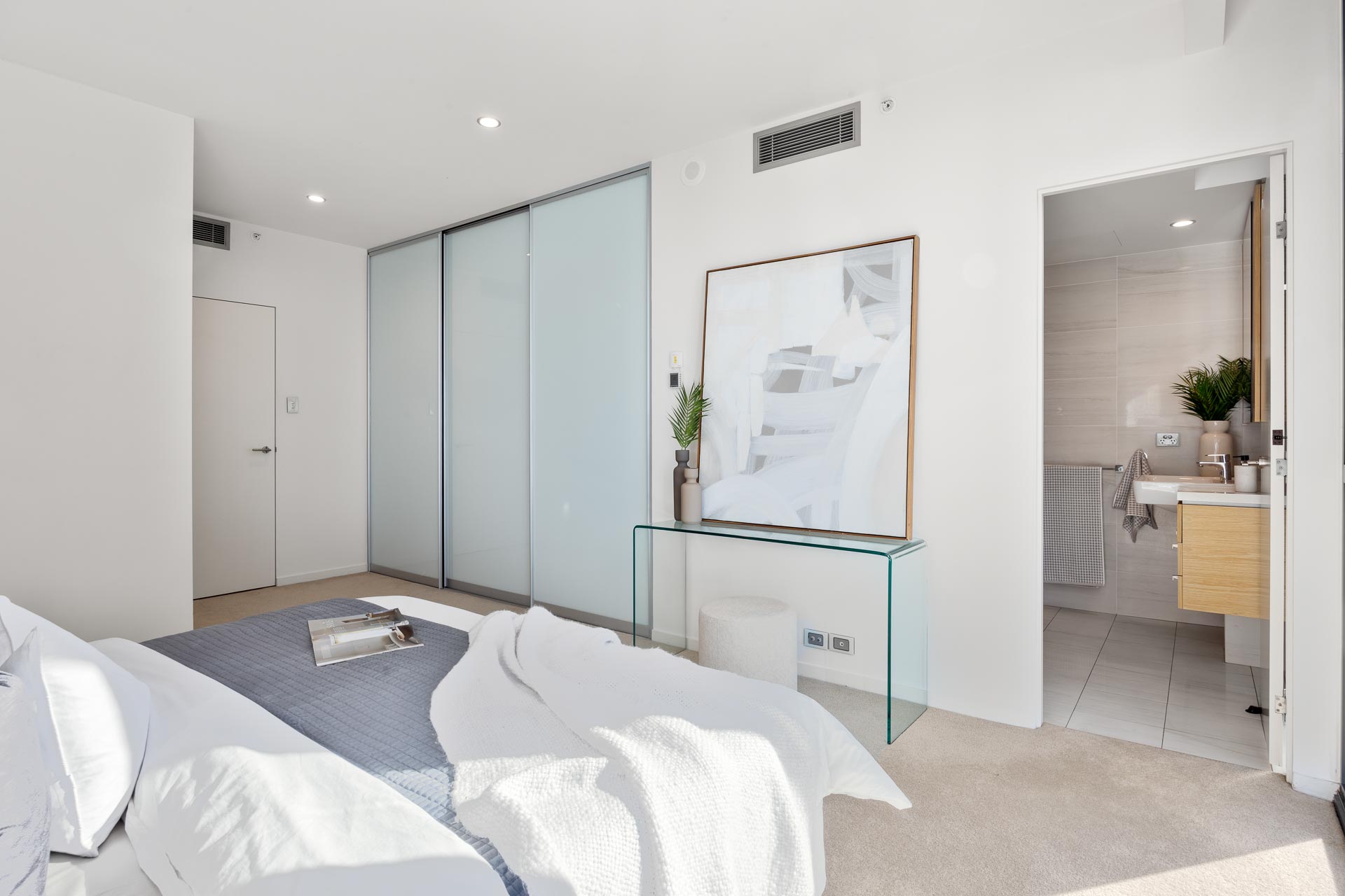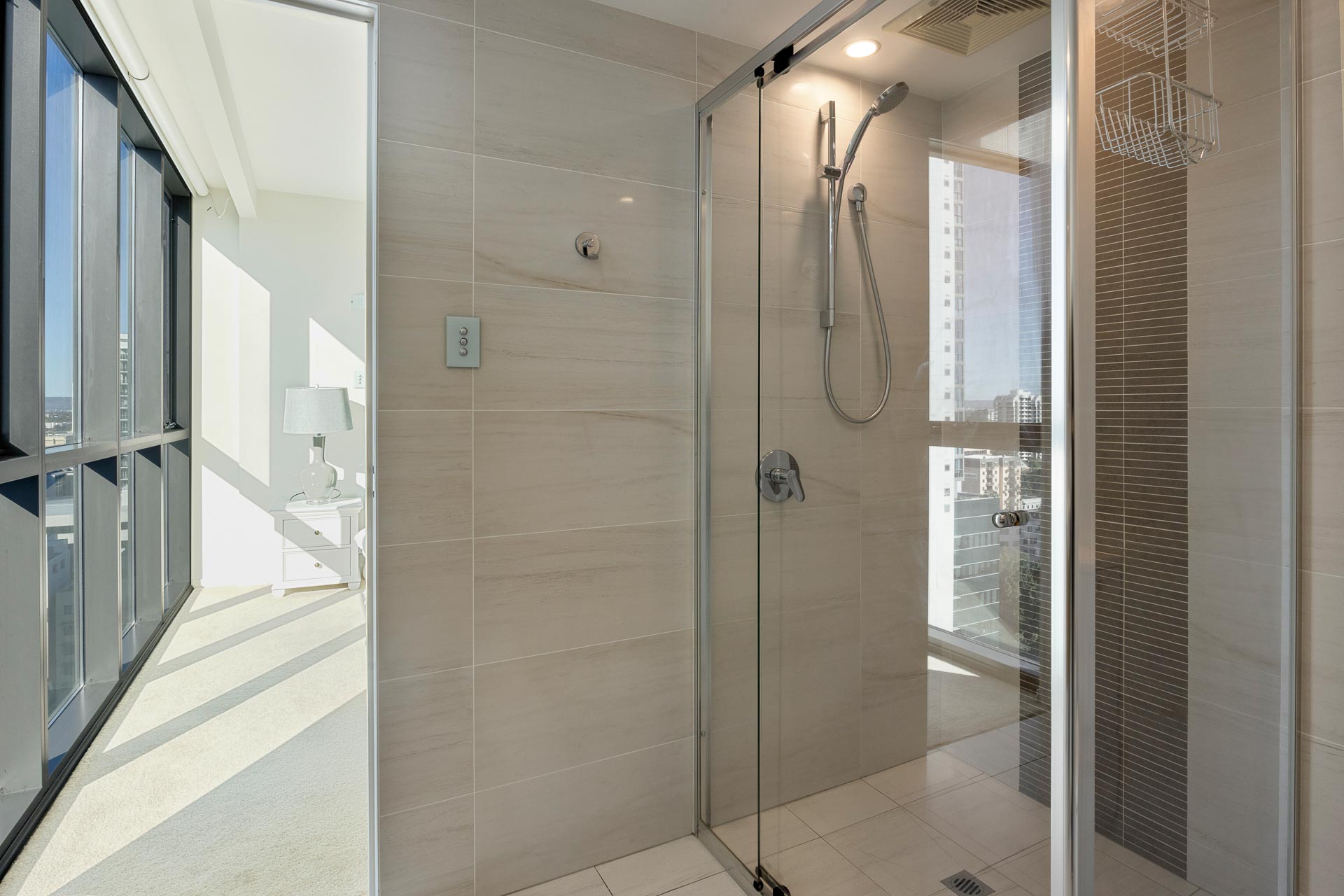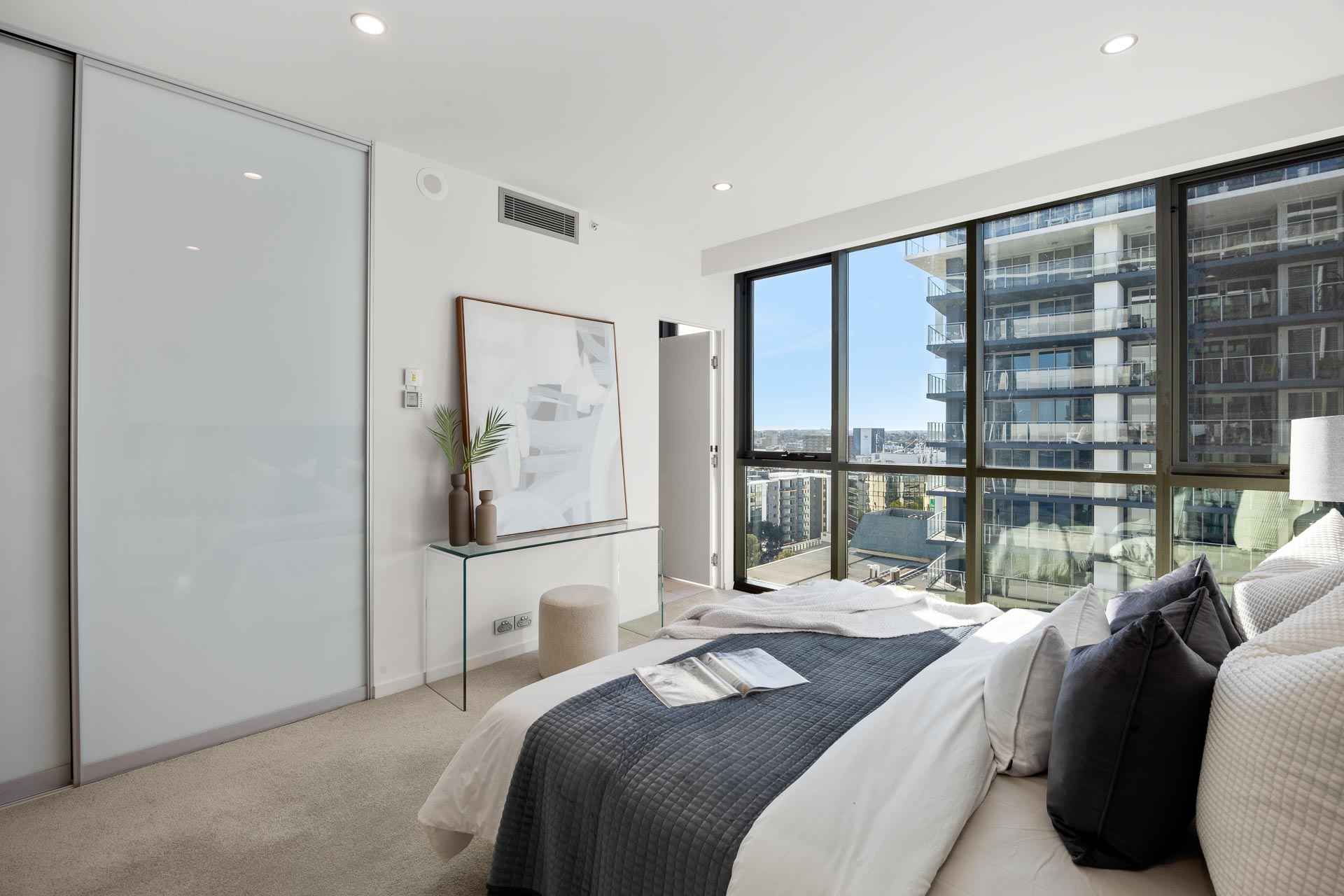 The master bedroom is particularly generous, and features a stunning north facing city aspect with floor to ceiling glass, a row of built in robes and a contemporary ensuite bathroom with floor to ceiling oversized neutral tiles, crisp white stone benchtops, stainless steel tapware and mosaic feature tiling.
