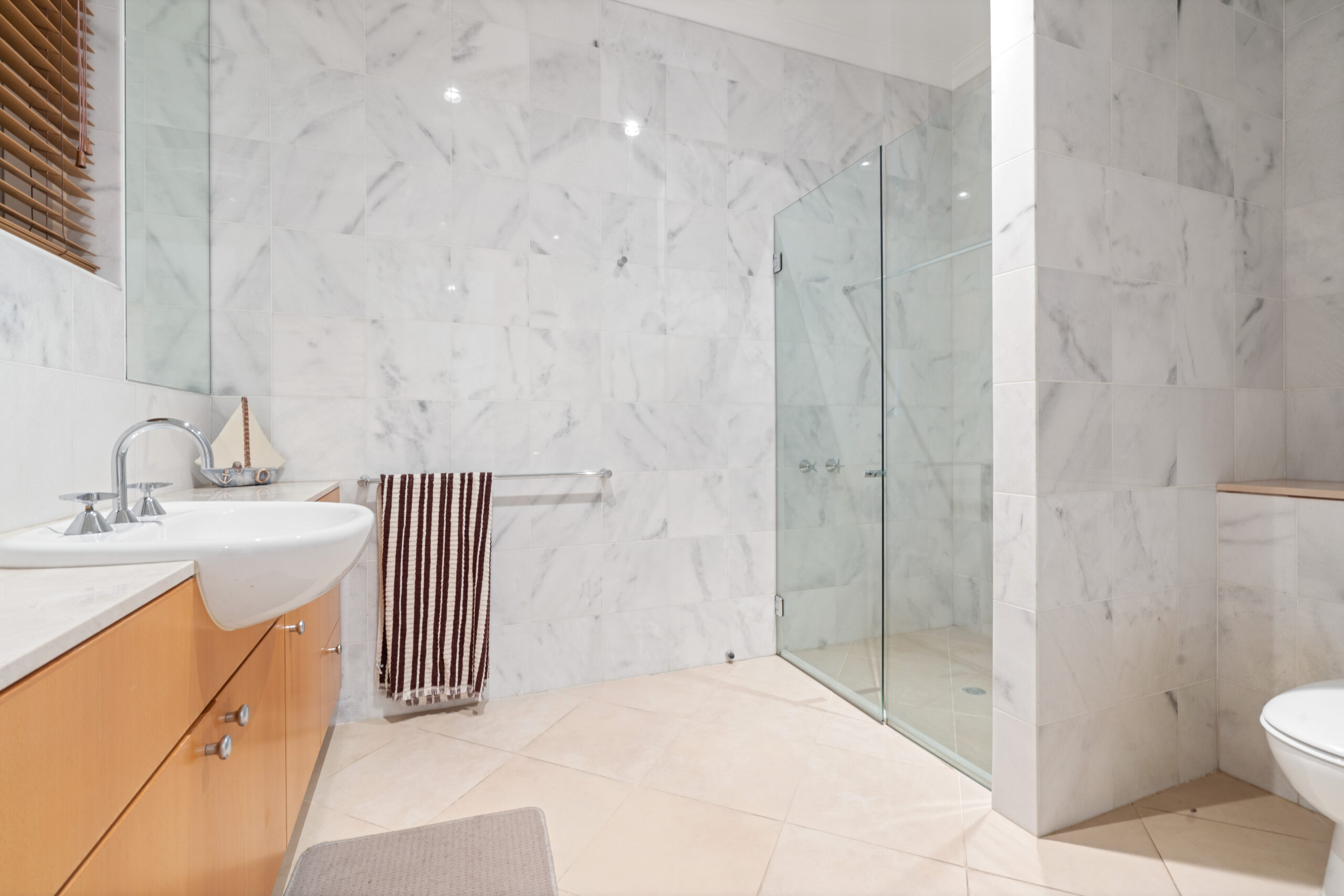 The master suite is a private sanctuary, complete with direct river views, a luxurious ensuite, and a generous walk-in robe. Stone-topped vanities, a corner spa bath, and custom cabinetry bring a sense of indulgence, while practicality is never compromised. The second bedroom enjoys its own ensuite and built-in robes, creating flexibility for family, guests, or work-from-home arrangements. A powder room, large laundry, and extensive storage reinforce the highly functional layout.