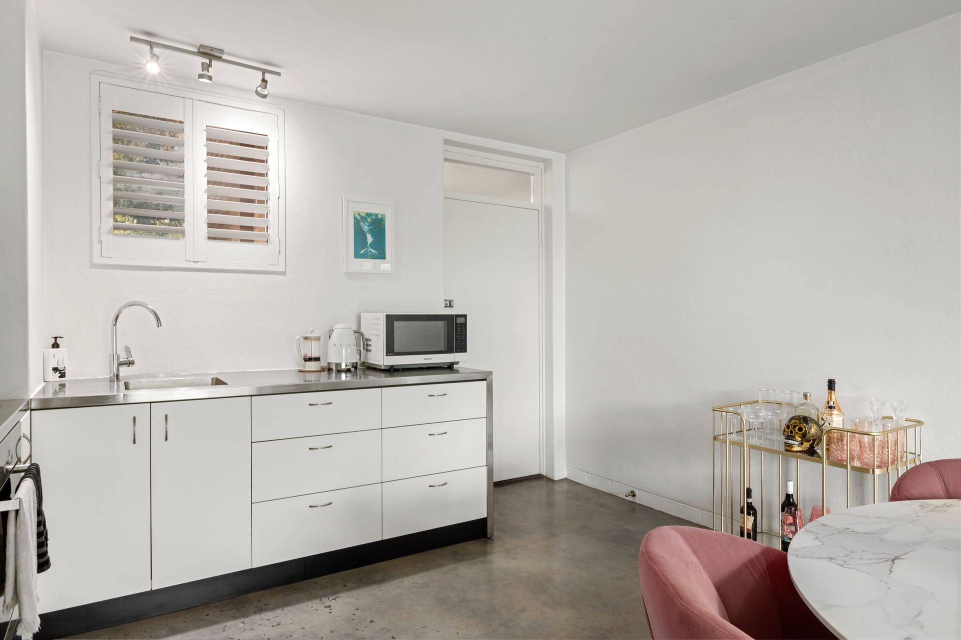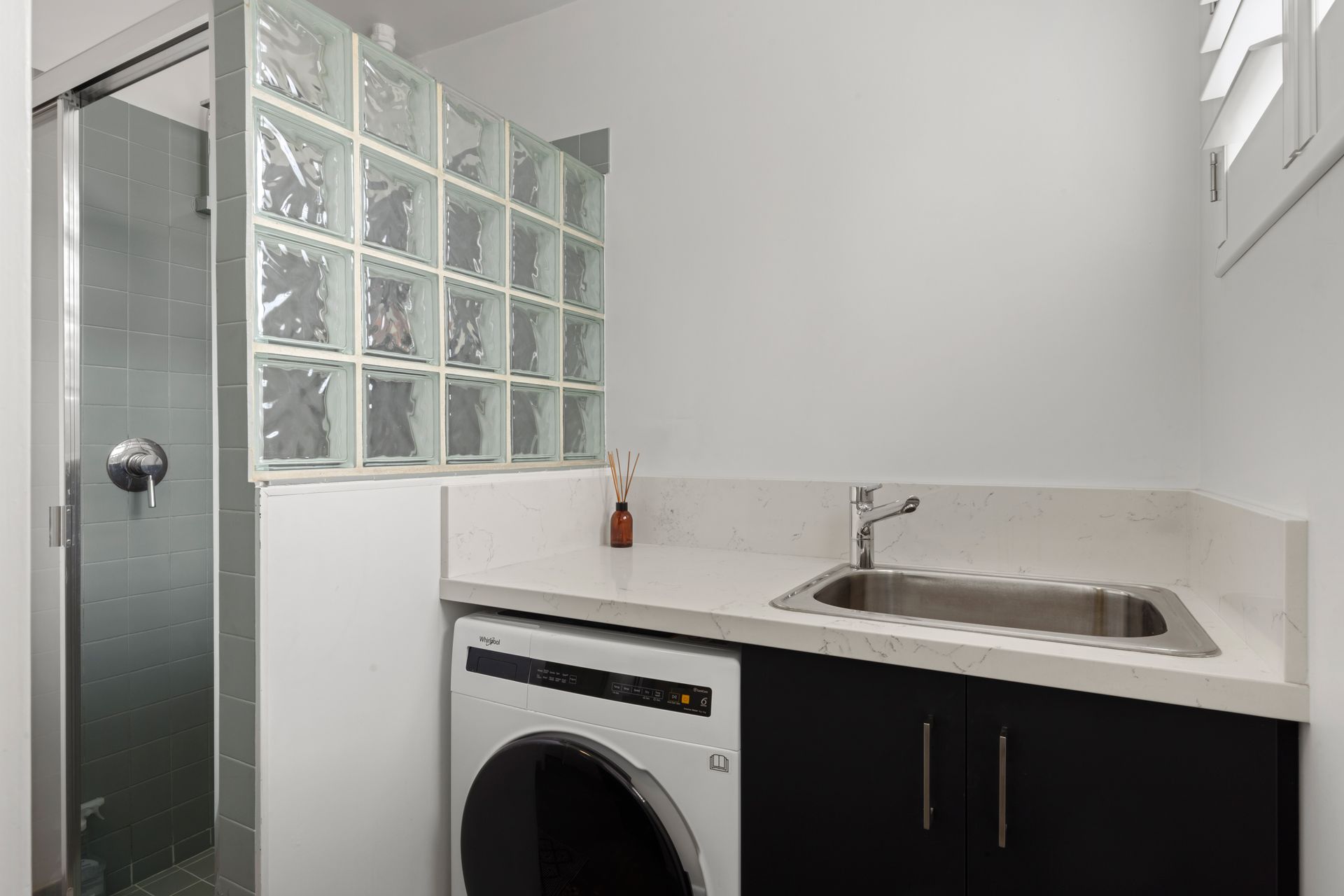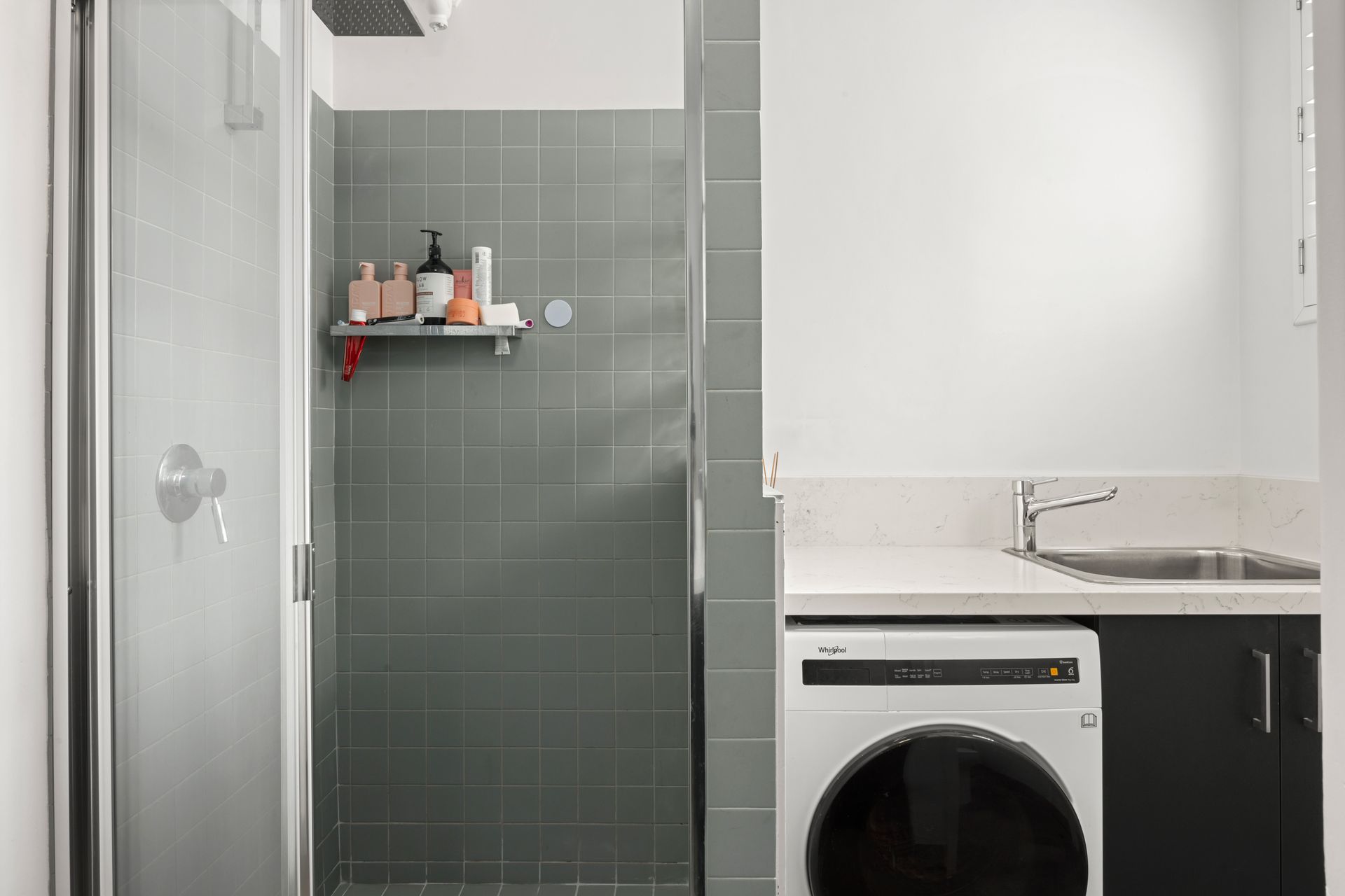 It even enjoys the luxury of its very own integrated laundry within the bathroom, eliminating the need to use the shared facilities at ground level. The cleverly-revamped and light-filled wet area makes the most of the wall and floor space on offer, boasting a stone vanity, a separate stone wash trough, a rain shower and toilet.