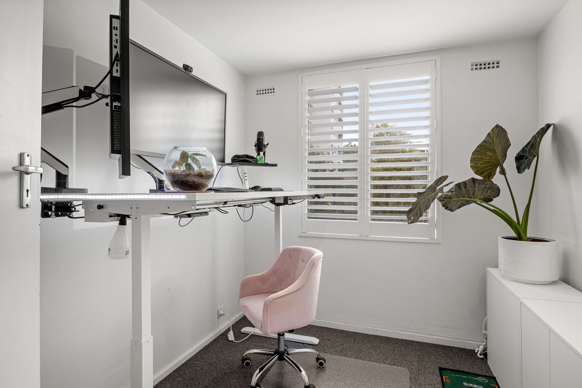 The secondary bedroom is currently used as a home office and has plenty of natural light.