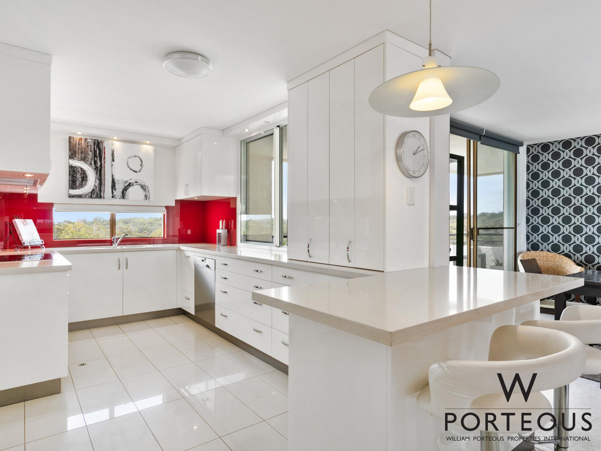 The kitchen is spacious with stone benchtops and finished with a full array of premium German appliances. This open into the dining room and also has a servery out onto the large North facing, park side balcony.